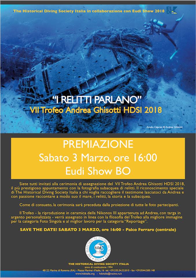 Sempre nell’ambito della fotografia, la Historical Diving Society ha presentato il Trofeo Andrea Ghisotti HDSI 2019, giunto ormai alla sua ottava edizione, inteso a premiare la foto ed il reportage in concorso che ha meglio interpretato quest’anno lo spirito di cultura per il mare, i relitti, la storia e la subacquea, che animò sempre il lavoro del indimenticabile giornalista e fotografo sub Andrea Ghisotti. Durante la premiazione condotta da Angelo Mojetta, sono stati presentati i lavori premiati ai cui autori è stata consegnata una prestigiosa riproduzione in ceramica della Nikonos III di Andrea Ghisotti, con una targa personalizzata in argento, oltre che il Crest della Historical Diving Society Italia.