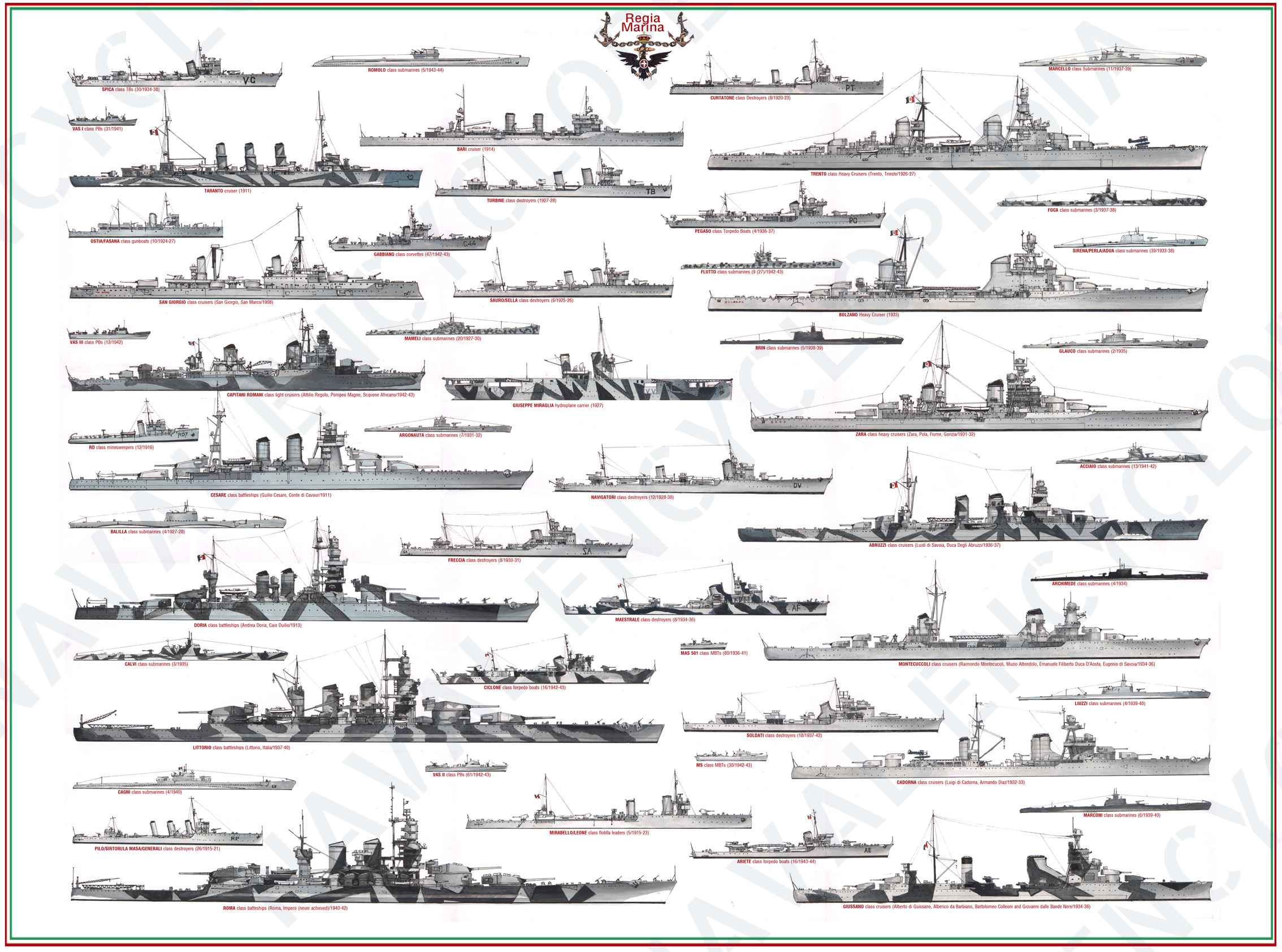 L’Italia entrò in guerra nel giugno 1940 e la combatté con unità navali costruite in prevalenza tra il 1923 e il 1937. Ciò fu dovuto al fatto che, con la conquista dell’Etiopia e la proclamazione dell’Impero (1936), si era chiuso il ciclo principale di ammodernamento armonico ed equilibrato del naviglio della Regia Marina nelle sue diverse categorie.