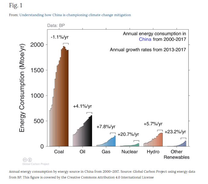 Il rapido successo della Cina nel limitare le proprie emissioni di CO2 ha sorpreso molti osservatori; di fatto questo successo sembra derivare  da un aumento dell’impiego delle fonti rinnovabili e da una diminuzione della produzione e del consumo di carbone (vedi Fig. 1). L’aumento dell’uso di energie rinnovabili ha implicato un rapido sviluppo della capacità domestica installata, iniziato nell’ambito del meccanismo di sviluppo pulito (CDM) previsto dal Protocollo di Kyoto.
