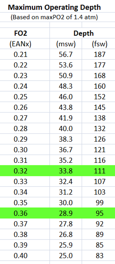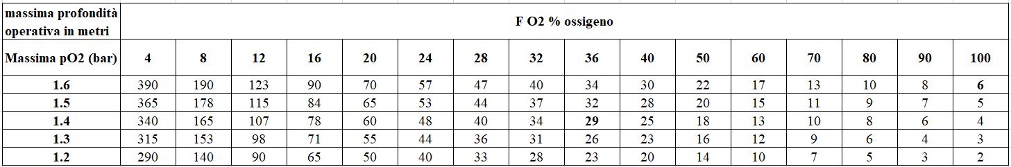 dove pO2 sarà la pressione parziale di ossigeno massima e FO2 la frazione di ossigeno nella miscela (ovvero la % di ossigeno). Ad esempio, immaginiamo di avere a disposizione una miscela nitrox al 36% (36% ossigeno 64% azoto). Se un gas contiene il 36% di ossigeno (FO2 = 0,36) e se il massimo pO2 limitante lo fissiamo a 1,4 atmosfere assolute, la massima profondità operativa sarà circa 29 metri, come ottenuto tramite la formula: