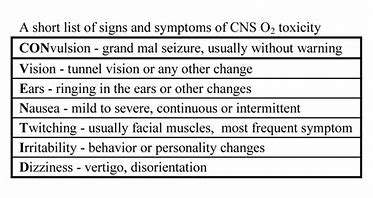 Questo dipende dalla pressione parziale dell’O2 nel gas respirabile e dalla durata dell’esposizione anche se esiste un’un’ampia variazione, sia tra individui diversi, sia per la stessa persona in condizioni fisiche diverse. Sembrerebbe che l’influenza di fattori diversi come l’esposizione al freddo, la stanchezza, il tipo di immersione, assunzione di sostanze eccitanti (caffeina, teina) influisca sulla comparsa dei sintomi del CNS. La tossicità neurologica dell’ossigeno si manifesta, senza preavviso, con convulsioni, fischi nell’orecchio, nistagmo (occhio che batte di lato), visione a tunnel, irritabilità, vertigini.