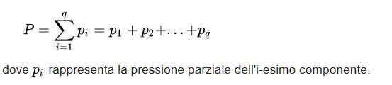 La pressione parziale Pi di un componente di una miscela di gas è la pressione che questo avrebbe qualora occupasse, da solo, il volume a disposizione dell’intera miscela alla medesima temperatura T. Da cui deriva che la pressione totale può essere matematicamente definita come: