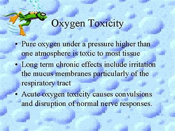 L’esposizione prolungata a livelli di ossigeno aumentati a pressione normale può provocare tossicità a livello polmonare e oculare. I sintomi possono includere disorientamento, tosse secca, difficoltà a respirare, bruciore al petto. L’esposizione prolungata a pressioni parziali di ossigeno superiori alla norma o esposizioni più brevi a pressioni parziali molto elevate può causare danni ossidativi alle membrane cellulari, collasso degli alveoli polmonari, distacco della retina e convulsioni.