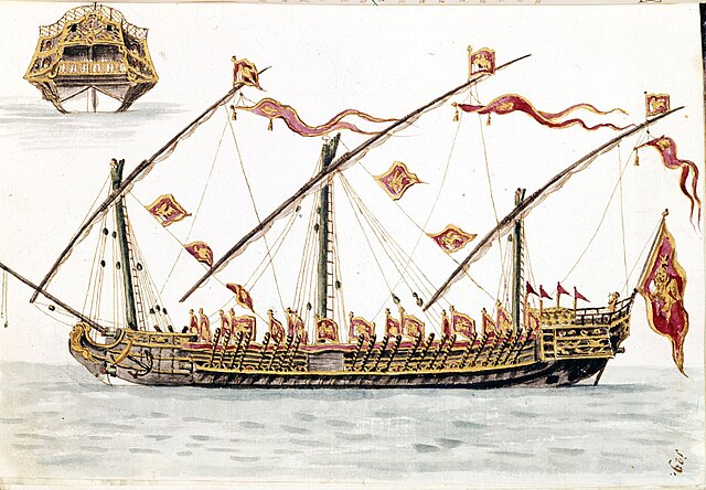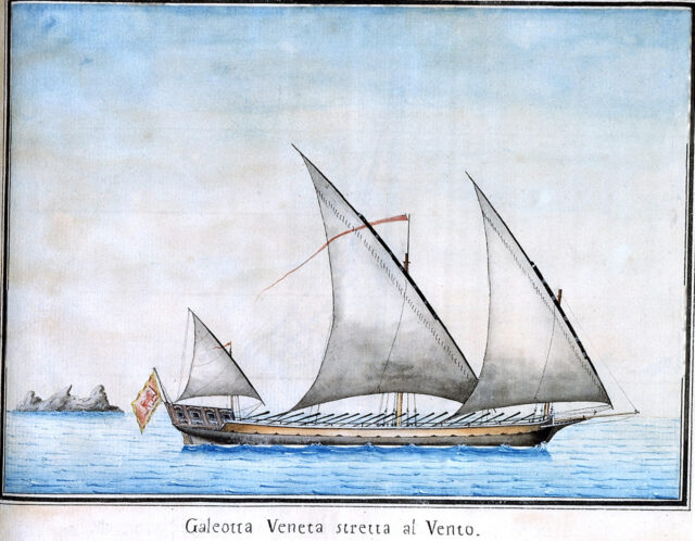 La galeota aveva due alberi e circa 16 remi per lato e normalmente disponeva tra due a dieci cannoni di piccolo calibro, imbarcando tra 50 e 150 uomini di equipaggio – galiota veneta al vento – Fonte National Maritime Museum, Greenwich