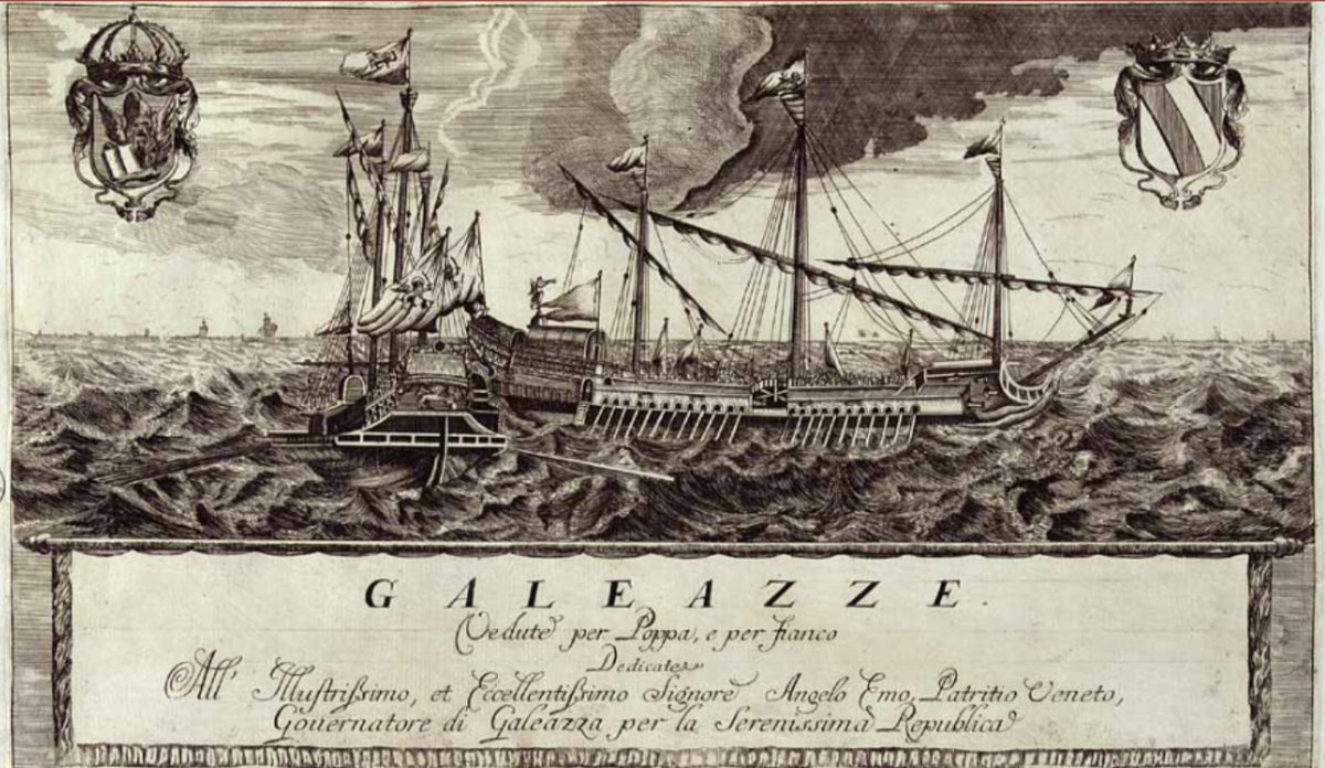 Galeazza veneziana – Fonte Gli Abiti de’ Veneziani di quasi ogni età con diligenza raccolti e dipinti nel secolo XVIII – Autore Jan van Grevenbroeck