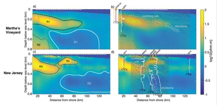 Rilievo elettromagnetico delle acque sotterranee sulla piattaforma continentale atlantica degli Stati Uniti. Notate i profili CSEM rimorchiati in superficie (linee tratteggiate bianche) e stazioni MT poste sul fondo del mare (triangoli bianchi) al largo del New Jersey e Martha’s Vineyard. Le linee continue gialle mostrano le porzioni dei profili di rilevamento in cui i dati EM confermano la presenza di acqua a bassa salinità. I cerchi che indicano pozzi on shore e off shore sono di colore giallo dove sono state osservate salinità di fluidi a bassa porosità (<15) in mare aperto o dove le falde acquifere sono state identificate tramite dati geofisici a terra. I cerchi magenta indicano dove sono state rilevate solo acque ad alta salinità (> 15). I pozzetti presenti nel testo sono etichettati con una dimensione del carattere maggiore. La linea tratteggiata bianca indica la morena terminale della calotta glaciale di Laurentide all’ultimo massimo glaciale. Questa mappa è stata creata utilizzando GMT-5.4.3.