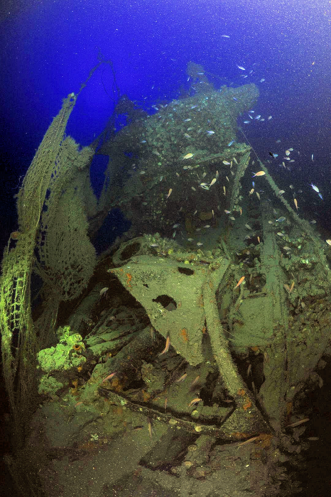 Il relitto è davvero un ago conficcato nel fondo del mare e la sua forma affusolata poco aiuta a proteggersi dalla corrente in questo frangente. Scendiamo lungo la murata di sinistra fino ai -119m. La visibilità oggi è ottima, si leggono chiaramente le strutture del sottomarino. Fermo l’occhio su un dettaglio che non avevo mai colto nelle precedenti immersioni. “È davvero quel che credo ciò che sto osservando?“. Tra le lamiere ritorte scovo una canna binata piuttosto importante, poi l’occhio legge distintamente la lavorazione a sbalzo che costituisce il foro che dava l’ultimo invito rotativo al proiettile. “È un cannoncino binato“, penso ed è proprio così: era l’armamento di poppa che è stato fondamentale per gli storici nell’attribuire la paternità del relitto all’U455 della Kriegsmarine.