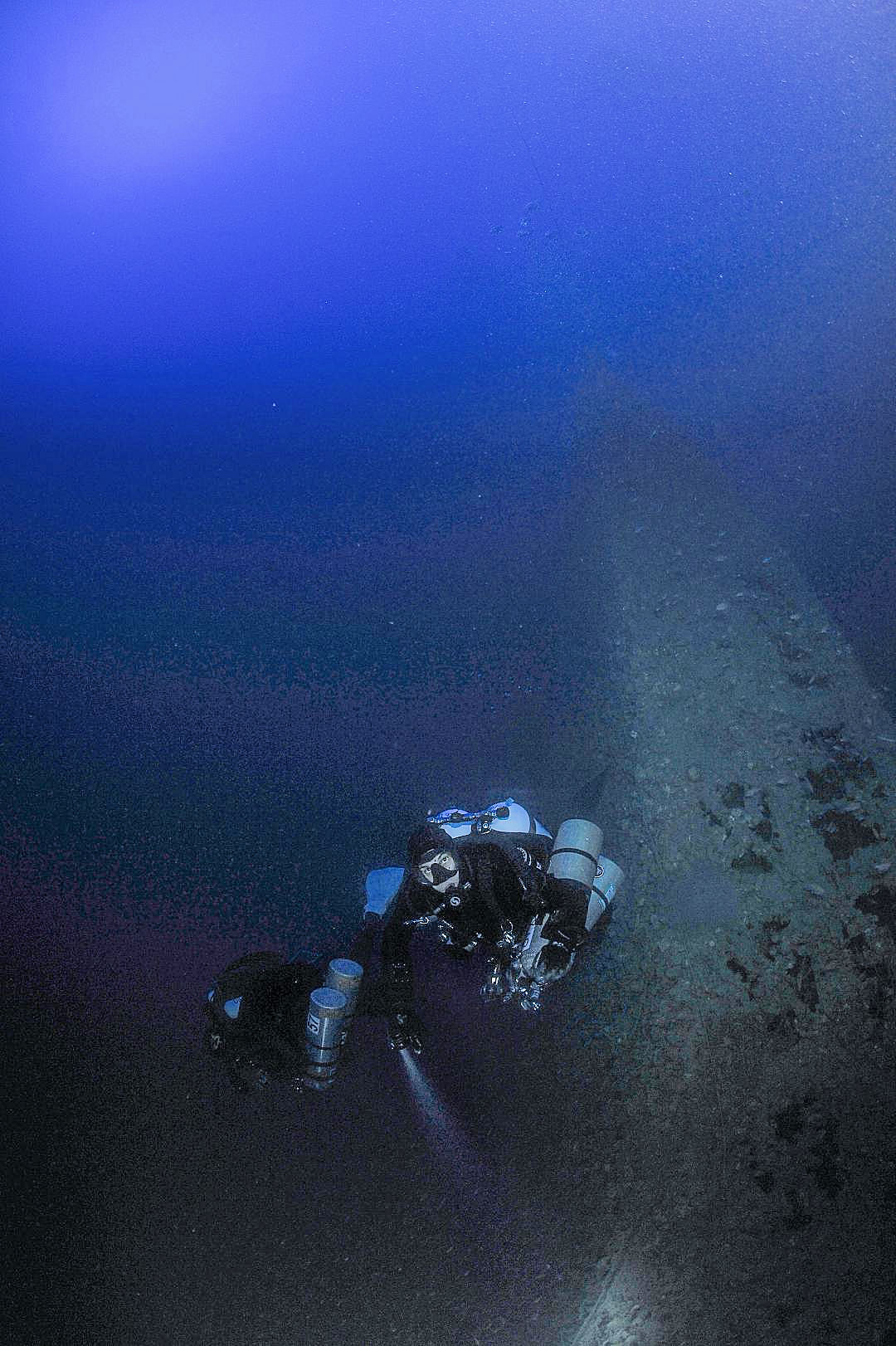 Mentre montiamo le attrezzature, i sorrisi lasciano poco per volta lo spazio al silenzio e alla concentrazione. In banchina tutto tace, ciascuno si prepara ad affrontare l’immersione con il giusto distacco emotivo che richiedono queste profondità. I rebreather sono pronti per essere caricati, io sarò l’unico a scendere in circuito aperto. Il silenzio irrompe la piacevole euforia che serpeggia tra il team. Abbiamo pianificato 25 minuti di fondo sul relitto a una profondità compresa tra i -87 metri della prua e i -119 metri dell’innesto del troncone principale nella sabbia del fondale.