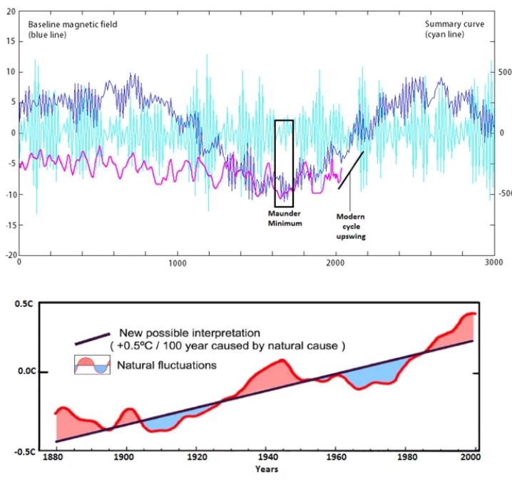 Secondo uno studio esistono oscillazioni della linea di base del campo magnetico e dell’irradiamento solare su una scala temporale millenaria, fattori importanti che influenzano la temperatura sulla Terra. Sebbene basato su alcune imprecisioni, non condivise, relative al presupposto che le orbite della Terra e del Sole attorno al baricentro del Sistema Solare non fossero correlate, e la distanza Terra-Sole cambiasse di una quantità paragonabile alla distanza Sole-baricentro, ipotesi imprecisa perché i moti della Terra e del Sole sono principalmente dovuti a Giove e agli altri pianeti giganti, che accelerano la Terra e il Sole quasi nella stessa direzione, e quindi generano moti altamente correlati della Terra e del Sole, lo studio contiene alcuni grafici di interesse. Nel controverso studio, analizzando le variazioni del campo magnetico solare associato all’attività solare negli ultimi centomila anni, gli autori ritengono che negli ultimi 3000 anni si siano verificati nove grandi cicli solari di 350–400 anni, che sono stati causati dagli effetti combinati di due onde magnetiche generate dalla dinamo solare. Durante tutti questi cicli il clima cambiò significativamente.