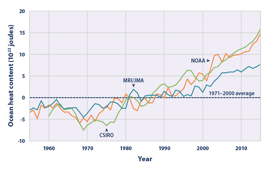 Non è una novità. Secondo il sommario tecnico Climate Change 2013 per l’Intergovernmental Panel on Climate Change (IPCC), gli strati superficiali degli oceani (dalla superficie a 700 metri di profondità) si sono riscaldati dal 1971 al 2010. Sebbene vi sia meno certezza sulle variazioni prima del 1971, a causa della scarsa disponibilità di dati nei periodi di tempo precedenti, emerse che dal 1957 al 2009 l’oceano ebbe un riscaldamento nella fascia tra i 700-2000 metri, e che probabilmente dal 1992 al 2005 vi era stato un aumento in profondità al di sotto dei 3000 metri. Curiosamente non furono osservate variazioni significative della temperatura media globale tra i 2000 e i 3000 metri di profondità.