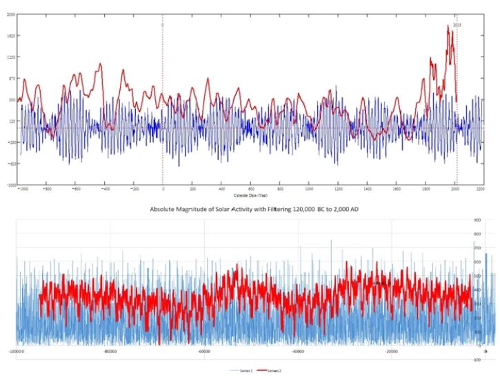 La curva risultante rivela una correlazione con la presenza delle macchie solari e le variazioni del clima terrestre, inclusi i minimi di Maunder (1645-1715), di Wolf (1200), di Oort (1010–1050), di Homer (800–900 a.C.) combinati con i massimi solari nel periodo caldo medievale (900-1200), nel caldo romano (400–10 a.C.). Interessante vedere che secondo questo studio si preveda un minimo solare che potrebbe iniziare nel 2020 e durare fino al 2055.