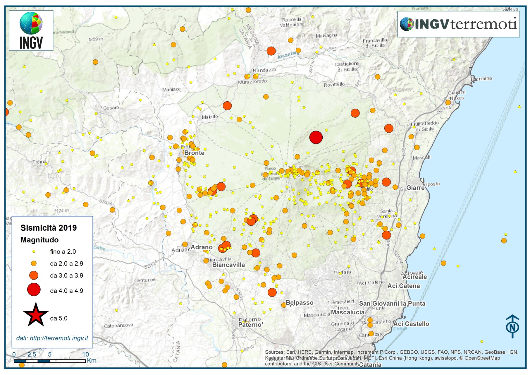 Ricorderete che nel mese di dicembre 2018 l’attività sismica in quell’area fu molto intensa, specie nei settori orientale e meridionale. In queste aree si sono verificati i terremoti più forti, incluso l’evento registrato il 26 dicembre 2018 di magnitudo Mw 4.9 (ML 4.8) nel comune di Viagrande (CT). Anche nel 2019 la sismicità nell’area etnea è stata frequente: in particolare, nei primi giorni dell’anno il 9 gennaio, si è verificato un terremoto di magnitudo Ml 4.1 con epicentro nel comune di Linguaglossa (CT), in un settore differente rispetto a quelli degli epicentri dei terremoti di fine 2018.