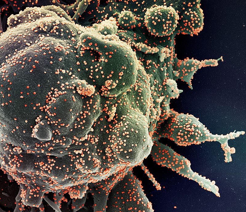 in anteprima micrografia elettronica a scansione colorata di una cellula apoptotica (verde) fortemente infettata da particelle di virus SARS-COV-2 (arancione), isolata da un campione di paziente – Fonte NIAID