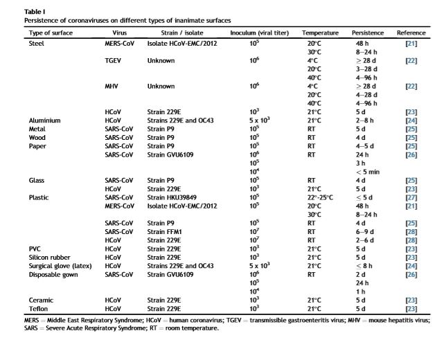 In estrema sintesi è emerso che il ceppo endemico di coronavirus umano (HCoV-) 229E, uno dei sette ceppi comunemente diffusi che possono provocare dal comune raffreddore a esiti ad alta morbilità come polmonite e bronchiolite, può rimanere contagioso da due ore a nove giorni sulle superfici. Sebbene una temperatura più elevata (dai 30 °C ai 40 °C) riduca la durata della persistenza di MERS-CoV, TGEV e MHV, in caso di basse temperature (4 °C) la persistenza dei coronavirus veterinari TGEV e MHV può essere aumentata fino a ≥ 28 giorni. Per quanto sopra hanno stimato che i coronavirus che affliggono l’Uomo possono rimanere infettivi su superfici a temperatura ambiente per un massimo di nove giorni. Per fortuna ad una temperatura di 30 °C la durata della loro persistenza è più breve.