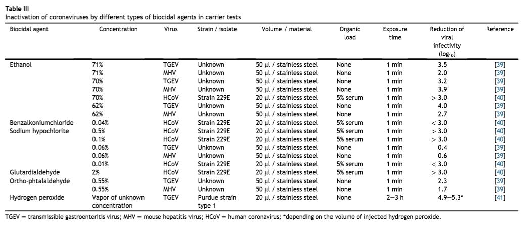La tabella III dello studio suggerisce che una concentrazione dello 0,1% sia efficace per almeno un minuto. Per la disinfezione di piccole superfici sembra che l’etanolo (62–71%) abbia rivelato un’efficacia simile all’ipoclorito contro il coronavirus. Una concentrazione dell’etanolo al 70% è anche raccomandata dall’OMS per disinfettare piccole superfici.