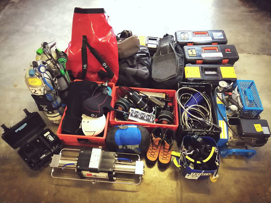 Torniamo indietro di qualche ora… Il campo è allestito. In religioso silenzio ciascuno spegne la luce frontale sul proprio casco e poco per volta si appresta a raggiungere la pozza d’ingresso al Sifone Verde.