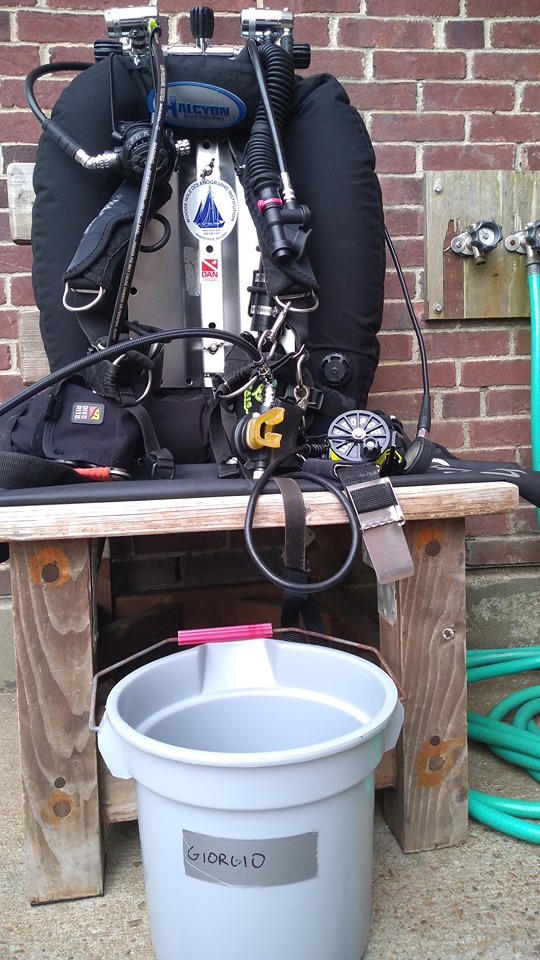 Per limitare il rischio di contagio ogni subacqueo risciacqua la propria attrezzatura usando acqua corrente a disposizione nella designata area di vestizione. Al risciacquo segue la sterilizzazione dei secondi stadi degli erogatori, maschera, snorkel e terminale del sistema di gonfiaggio a bocca del GAV/BCD. Detta sterilizzazione avviene per immersione totale in una soluzione pulente approvata per uso su attrezzatura subacquea. Liste di prodotti utilizzabili sono disponibili sui siti di diversi produttori e ad essi si rimanda per riferimenti specifici. Le attrezzature vengono quindi lasciate ad asciugare all’aria in appositi spazi designati in modo da mantenere una separazione tra le attrezzature dei diversi subacquei. Uno dei problemi riscontrati è stato quello di mantenere la sterilità dei secondi stadi; una soluzione adottata è quella di porre un telo sterile sulla superficie usata per assemblare e disassemblare l’attrezzatura. L’uso di acqua corrente per il risciacquo ovviamente necessita di avere larga disponibilità di acqua dolce pulita e questo, in alcune situazioni, potrebbe essere difficile.