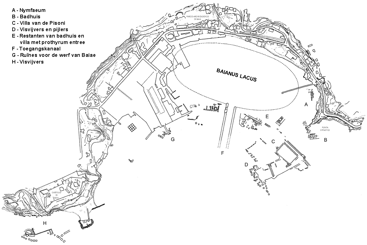 In mezzo al mare degli Dèi spiccavano l’Isola di Calypso, realizzata da Licinio Crasso Frugi, la villa che fu di Lucio e Gaio Pisone e il porto di Augusto, mentre dalla collinetta dirimpetto si stagliava la residenza privata di Nerone. Esattamente innanzi alla dorata spiaggia sacra alla “Beata Venere”, c’era il Lacus Baianus, sulle cui sponde si specchiavano i marmi ed i giardini pensili dell’antico Palazzo Imperiale della “Pusilla Roma”, oltre a un fastoso impianto termale di età repubblicana (c.d. Tempio di Mercurio).