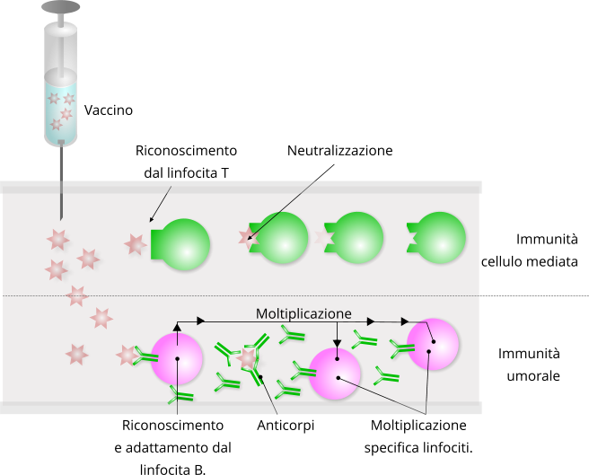 Le prime risposte avvengono mediante la produzione d’immunoglobuline, chiamate anche anticorpi, prodotte dai linfociti B in risposta alla penetrazione di un antigene nell’organismo. Le seconde avvengono tramite il contatto diretto dei linfociti T (T deriva dal Timo dove, dopo la produzione, migrano per maturare) con l’antigene estraneo, anche senza la produzione d’anticorpi da parte dei linfociti B. In aprole semplici, le cellule T pattugliano il corpo cercando e distruggendo le cellule infette, interrompendo la capacità del virus di replicarsi anche per anni. L’immunità a lungo termine può variare in base al tipo e anche al grado di risposta. Gli sviluppatori di vaccini spesso sperano di suscitare quella che è nota come immunità sterilizzante, una risposta, tipicamente mediata da anticorpi, che può impedire rapidamente ad un virus di attaccare l’organismo. Purtroppo non tutti i vaccini sono in grado di provocare gli anticorpi necessari per ottenere l’immunità. L’HIV[1], ad esempio, raramente induce anticorpi neutralizzanti, un fatto che ha complicato gli sforzi per sviluppare vaccini contro di esso.