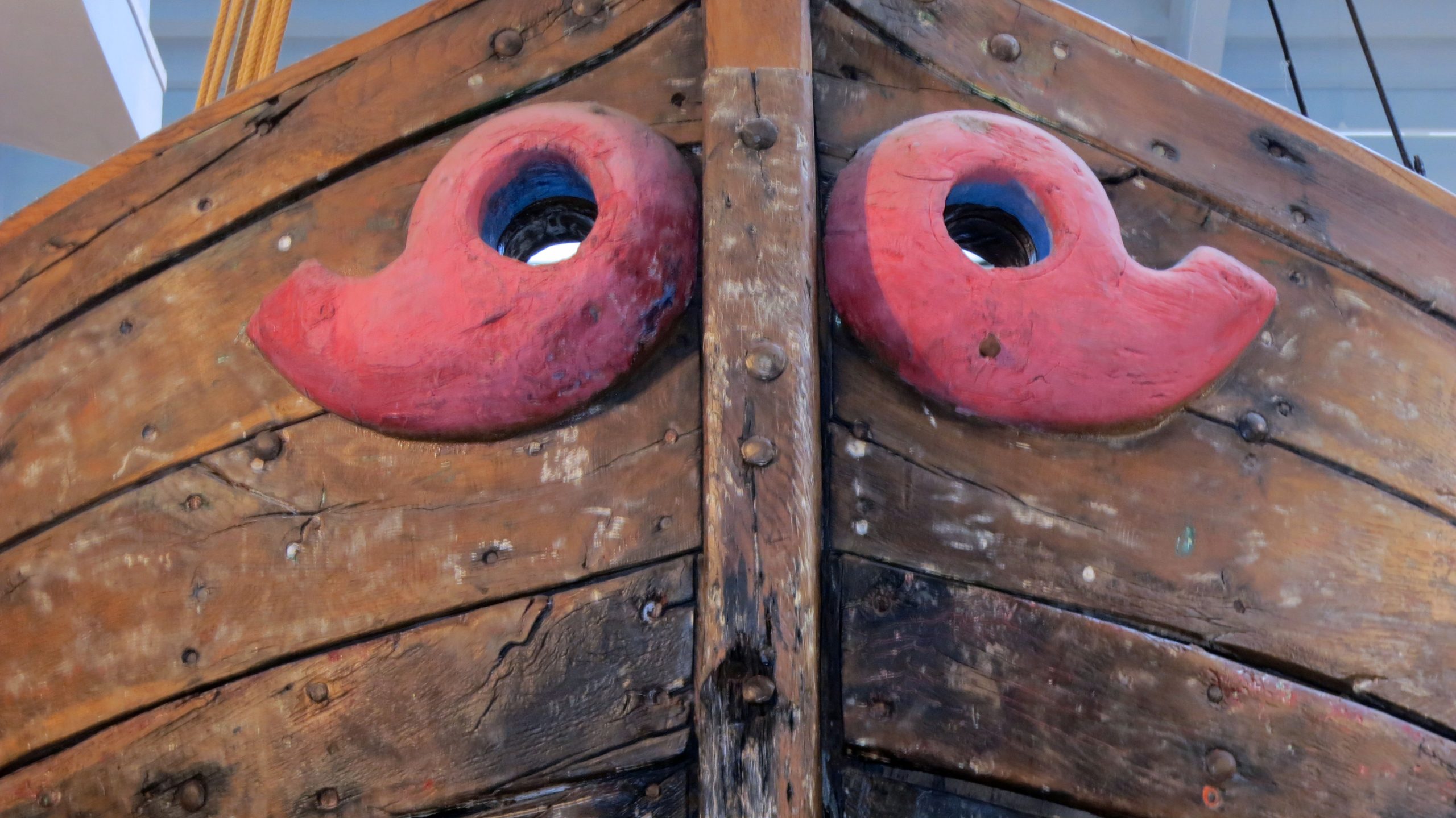 Non a caso venivano dipinti o scolpiti degli occhi sulla prua, gli “oftalmoi” (dal greco “ophtalmos”, che significa “occhio”) elementi figurativi con una funzione protettrice della barca e dell’equipaggio contro la sfortuna. Al momento del varo, gli antichi greci usavano sacrificare dio del mare Poseidone un toro e gli occhi disegnati sulle prore volevano ricordare gli occhi del povero animale che simboleggiava la forza ed il coraggio contro le avversità. Per altri la nave era assimilata ad un essere vivente, che aveva bisogno di occhi per guardare il cammino in mare davanti a sé.  Conosciuti anche come occhi di Horus, secondo la mitologia fenicia, quegli occhi ricordavano la terribile battaglia tra Horus e suo zio Seth, in cui il dio aveva perso l’occhio sinistro. Da allora il suo occhio è considerato simbolo di prosperità, di potere e buona salute e veniva posto sulle navi come amuleto protettivo per scongiurare tempeste e augurare una pesca quanto più prosperosa. Questa tradizione si mantiene sui bragozzi  (tradizionali barche da pesca adriatiche) e sui luzzi dell’isola Malta.