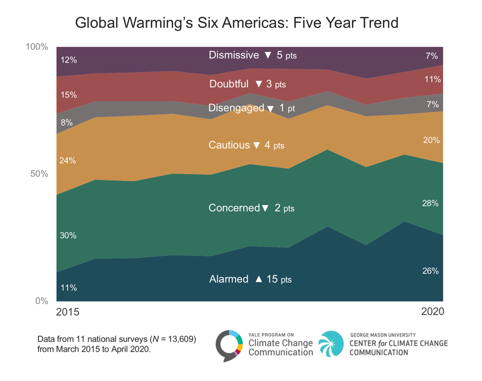 Dall’analisi dei dati sembrerebbe che ci sia stato un cambiamento significativo nella distribuzione dell’opinione pubblica negli ultimi cinque anni. Il segmento Allarmato è più che raddoppiato in termini di dimensioni (dall’11% al 26% della popolazione adulta degli Stati Uniti), mentre il segmento negazionista è diminuito di quasi la metà (dal 12% al 7%). Nel complesso, gli Statunitensi stanno diventando più preoccupati per il riscaldamento globale, più coinvolti con la questione e più favorevoli alle soluzioni climatiche. Facendo un raffronto negli ultimi dieci anni si apprezza che il gruppo più numeroso, i Preoccupati, è cresciuto rapidamente dal 2013 al 2015, ma da allora è leggermente diminuito. Gli Allarmati, al contrario, hanno registrato una crescita più rapida negli ultimi cinque anni rispetto a qualsiasi altro gruppo. Nel frattempo, i Cauti e i  Dubbiosi  si sono percentualmente ridotti negli ultimi anni.