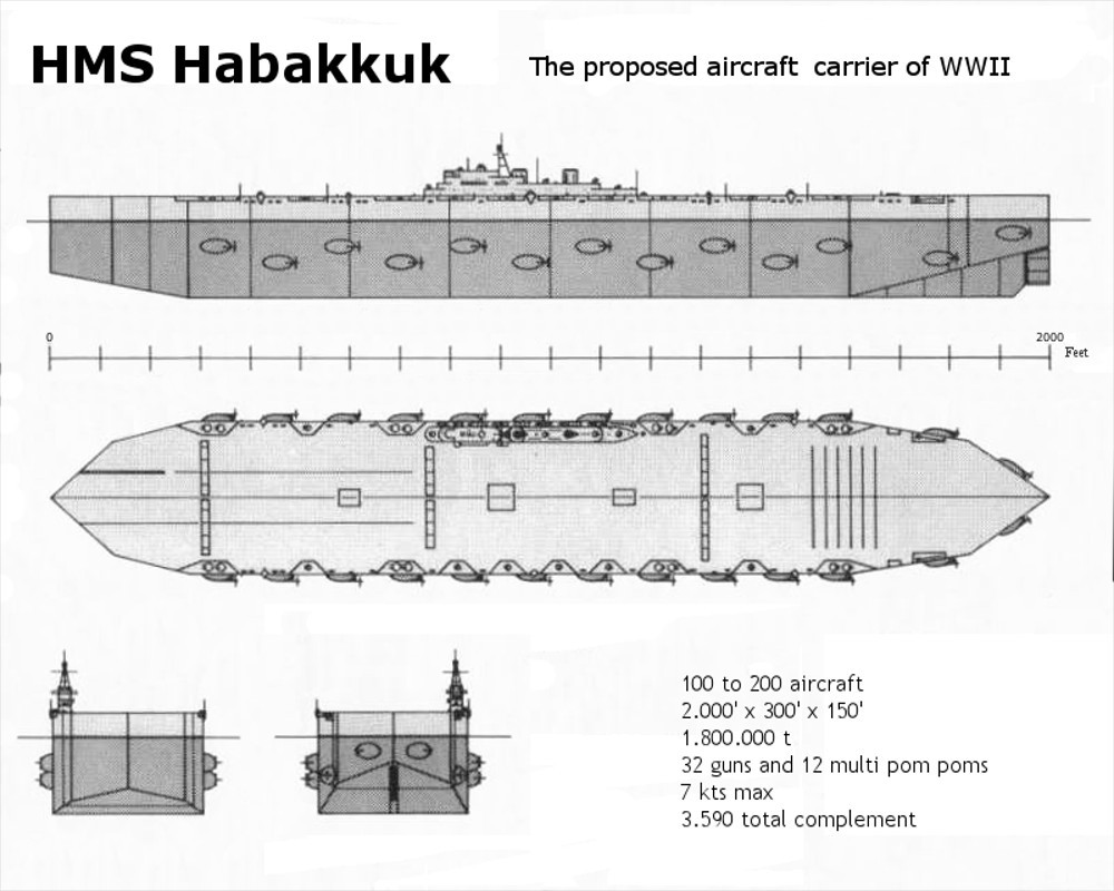 – Habakkuk II, il modello più vicino al modello originale di una nave semovente molto grande, lenta e realizzata in pykrete con rinforzi in acciaio. La nave avrebbe avuto una lunghezza di 1200 metri e una larghezza di 180 metri.