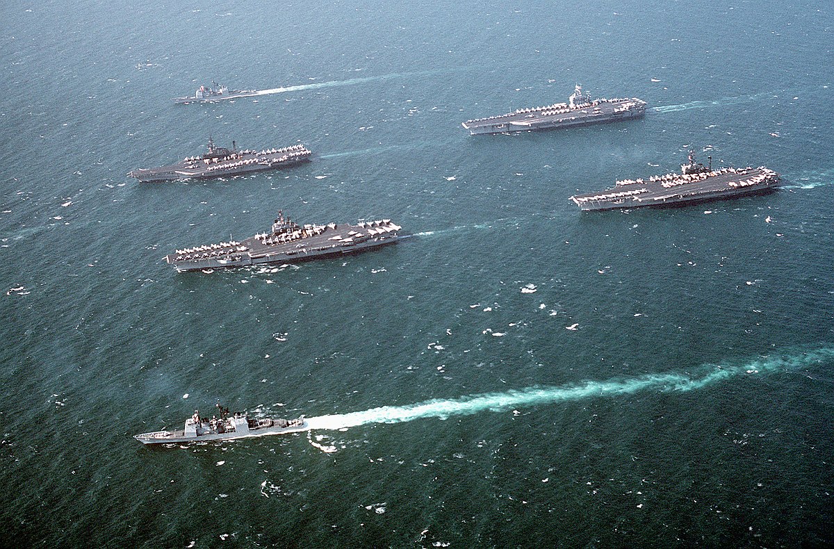 immagine in anteprima: Sei navi della Battle Force Zulu (Task Force 154) in formazione dopo il cessate il fuoco che pose fine all’operazione Desert Storm. A sinistra, dall’alto, l’incrociatore lanciamissili USS Leyte Gulf (CG-55), le portaerei USS Midway (CV-41) e USS Ranger (CV-61) e l’incrociatore lanciamissili USS Normandy (CG-60) – a destra in alto la portaerei a propulsione nucleare USS Theodore Roosevelt (CVN-71) e la portaerei USS America (CV-66) – un dispositivo importante che fu decisivo per le operazioni – Fonte http://usnhistory.navylive.dodlive.mil/2016/01/15/gulf-war-curator-of-the-navy-recalls-expirence-25-years-later-part-ii/ – autore U.S: Defense Imagery