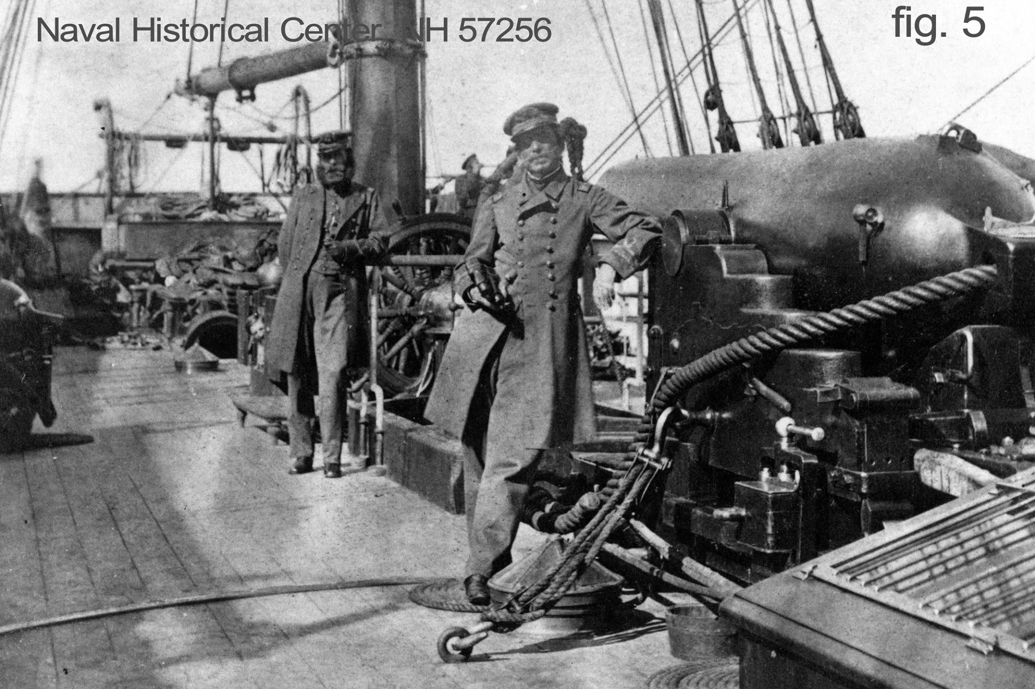 Nella fotografia scattata da Francois Rondin a bordo della USS Kearsarge pochi giorni dopo la battaglia, vediamo i due cannoni brandeggiati sulla sinistra [fig. 4]; dalle loro dimensioni paragonate alla larghezza della nave è possibile rendersi conto perché non si potesse collocarli a coppie sulle fiancate. Sparavano una palla piena del peso di 75 kg oppure una granata sferica pesante 61 kg. L’armamento secondario era costituito invece da 4 cannoni ad anima liscia da 32 lb (162 mm di calibro), pesanti circa 2 tonnellate, collocati due su ciascuna fiancata e da un cannone ad anima rigata ad avancarica da 30 lb (106 mm) collocato sul cassero di prua su affusto a perno. Complessivamente la nave poteva mettere in batteria su una fiancata cinque dei suoi sette cannoni. I due cannoni da 280 mm costituivano un armamento veramente poderoso se si considera che la corazzata britannica Warrior, aveva cannoni del calibro massimo di 203 mm. Per contro, il loro peso li rendeva difficilmente manovrabili in presenza di mare formato. L’armamento principale dell’CSS Alabama, che era di fabbricazione britannica, era anch’esso composto da due cannoni su affusto a telaio: uno era un cannone ad anima liscia da 8 pollici (203 mm), pesante 5,4 tonnellate che lanciava palle da 29 kg e granate da 18 kg.