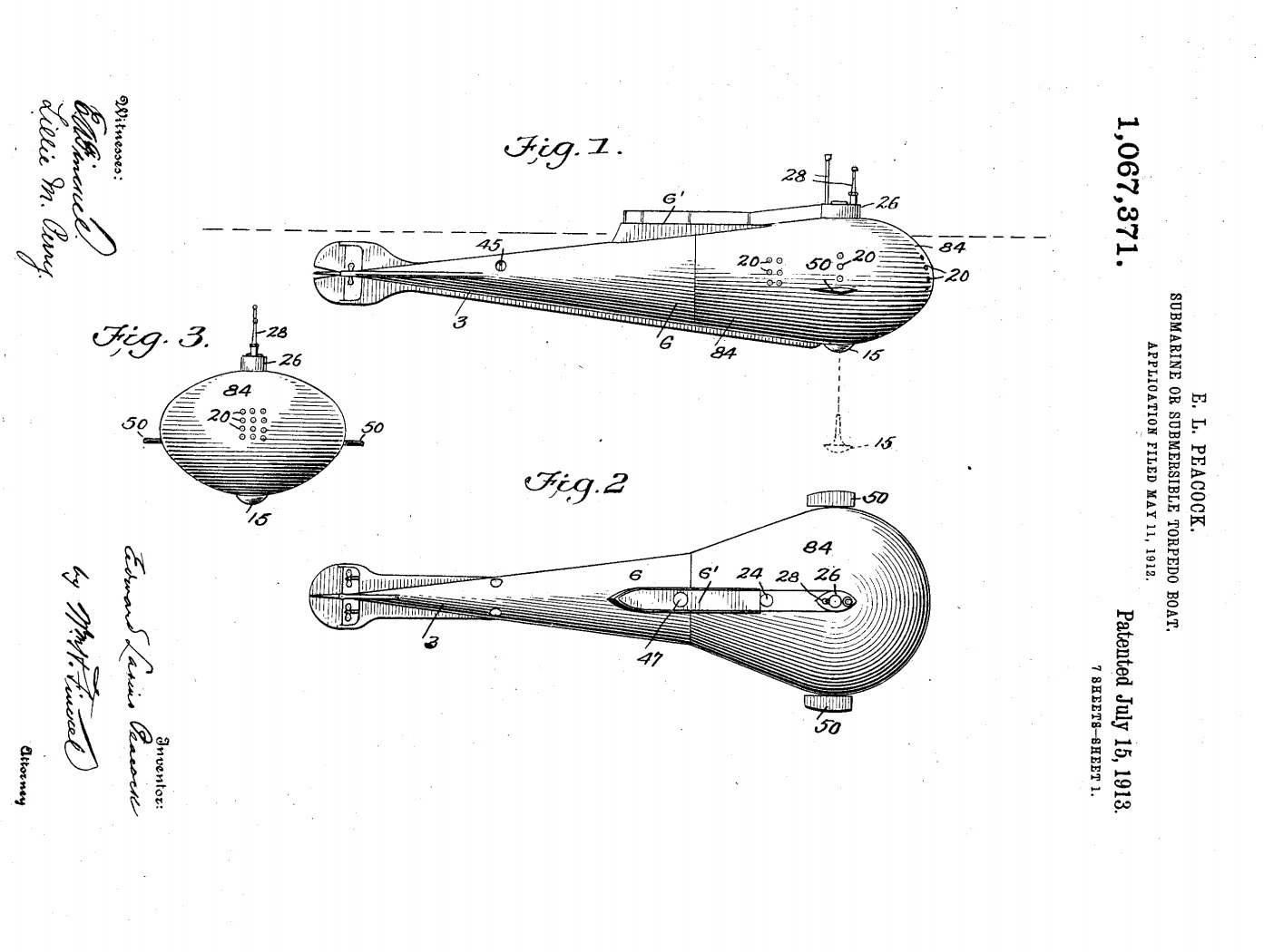 Ad osservare i disegni tecnici di questi sommergibili la prima reazione che suscitano è che, se fossero stati realizzati, sarebbero stati dei battelli subacquei decisamente bizzarri. Dalle notizie del tempo, quando il suo inventore, Edward Lasius Peacock brevettò il progetto del suo primo “sommergibile, o torpediniera sommergibile”, fu considerato uno dei più impressionanti del periodo. Peacock era un ingegnere britannico che lavorava negli Stati Uniti per la Lake Torpedo Boat Company di Bridgeport, Connecticut e, con il senno del poi, non possiamo dire che Peacock mancava di visione.