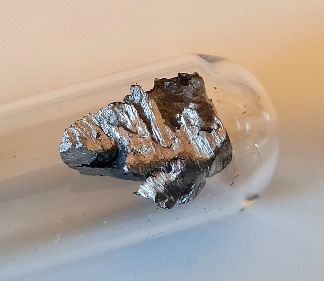 in anteprima: un campione di neodimio contenuto in una ampolla di gas argon per evitarne la rapida ossidazione. Il neodimio è un metallo appartenente al gruppo delle terre rare, o lantanidi, ed ha un aspetto argenteo e lucente – foto di Tobias Meints – CC attribuzione alike 4.0 Elementares Neodym.jpg – Wikimedia Commons