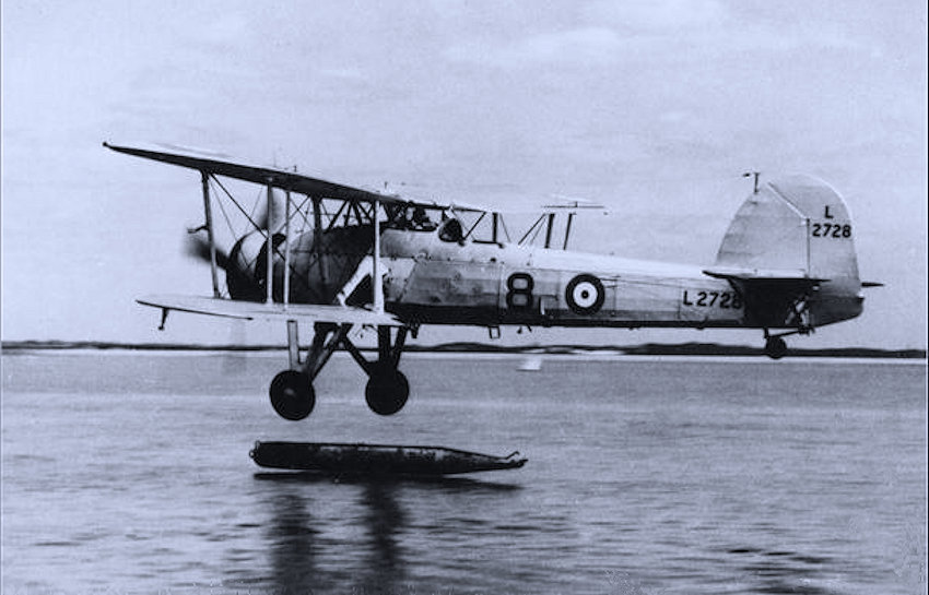 Una foto storica, 31 luglio 1931, un Soptwith Ship Camel (pilota S. Cully) imbarcato su una piattaforma trainata a circa 20 nodi da un caccia, tenta un decollo. Notate l’equipaggio che trattiene l’aereo mentre il pilota da motore per il decollo. Arrivato al massimo dei giri, sarebbero stati tolti i cunei id blocco e lasciato libero l’aereo di decollare. Di fatto il coraggioso pilota aveva solo 58 piedi di “pista” per portare l’aereo in volo o sarebbe precipitato in mare con conseguenze disastrose.  Fonte IWM