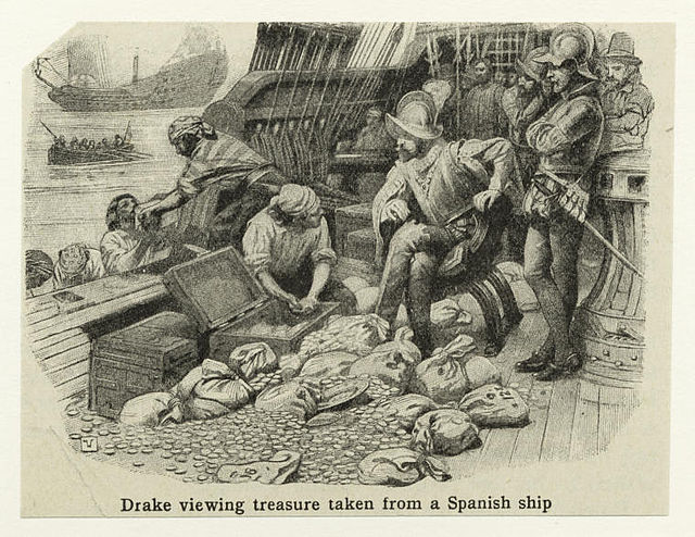 in anteprima Drake osserva il bottino da un nave spagnola – Fonte New York Public Library – credit “courtesy New York Public Library www.nypl.org”
