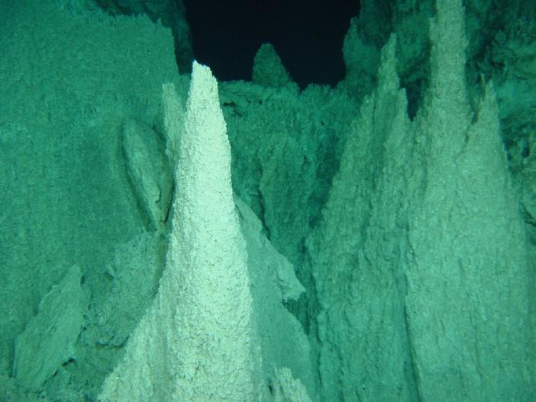 Carbonate chimneys at inactive hydrothermal vent sites of Lost City, Mid Atlantic Ridge. (c ) IFREMER, Exomar cruise 2005