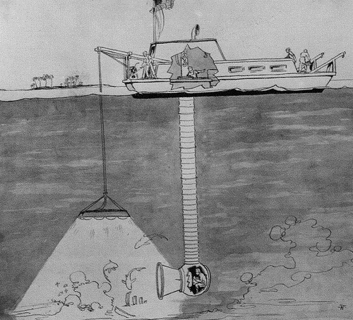 J.E., non meno ingegnoso, pensò di aggiungervi una sfera all’estremità con un ampio oblò a imbuto nel quale infilò dapprima una macchina fotografica poi, spinto dal grande successo della sua prima mostra e dalle pressioni del nascente mondo cinematografico americano, una macchina da presa. Un sistema di illuminazione calato dalla nave appoggio con un cavo rischiarava il fondale.