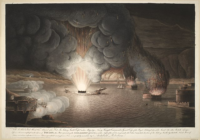 Una vista della distruzione da parte della flotta britannica delle navi e dell’arsenale francese a Tolone il 18 dicembre 1793. Guerre rivoluzionarie francesi (1792-1802): guerra della prima coalizione (1792-8). Tolone era il principale porto mediterraneo della marina francese; fu occupata dalla flotta britannica sotto il comando dell’ammiraglio Lord Hood. Tra settembre e dicembre 1793 le forze rivoluzionarie francesi, alle quali era assegnato Napoleone Bonaparte come colonnello di artiglieria, avevano circondato il porto. Alla flotta britannica, Sydney Smith (in seguito ammiraglio Sir Sydney Smith) fu ordinato di bruciare quante più navi e provviste francesi possibile. L’esplosione luminosa al centro è lo scoppio di una polveriera. Al di là di esso, a destra, si possono vedere l’arsenale francese in fiamme. La fortificazione a destra del porto è Le Gros Tour e, a sinistra, i forti Balaguir e Auguilette. Le file di soldati sulle rive che si affacciano sul porto a sinistra sono l’artiglieria francese- Fonte Veduta dell’incendio avvenuto a Tolone la notte del 18 dicembre 1793 sotto la direzione di Sir Sidney Smith di Arch.d Robertson 1794 con spiegazione in calce – autore Archibald Robertson – Toulon, 1793 RCIN 735020.a.jpg – Wikimedia Commons